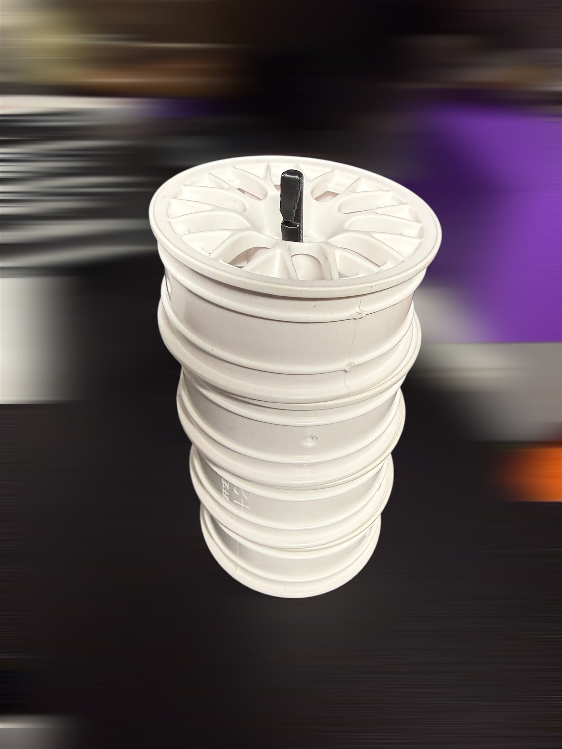 We have had 1/8th scale tire sticks in our inventory for a long time but we thought it was time to get the 10th scale tires organized. So these sticks are what we came up with! The end is a quick snap that will feed through the axle hole in each wheel. To remove the wheel, simply depress the tab and feed the wheel back over the tire stick.